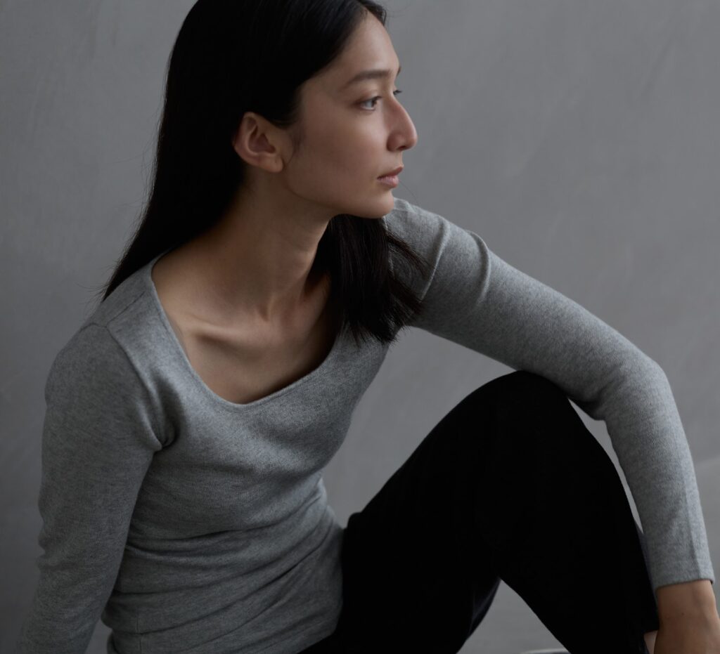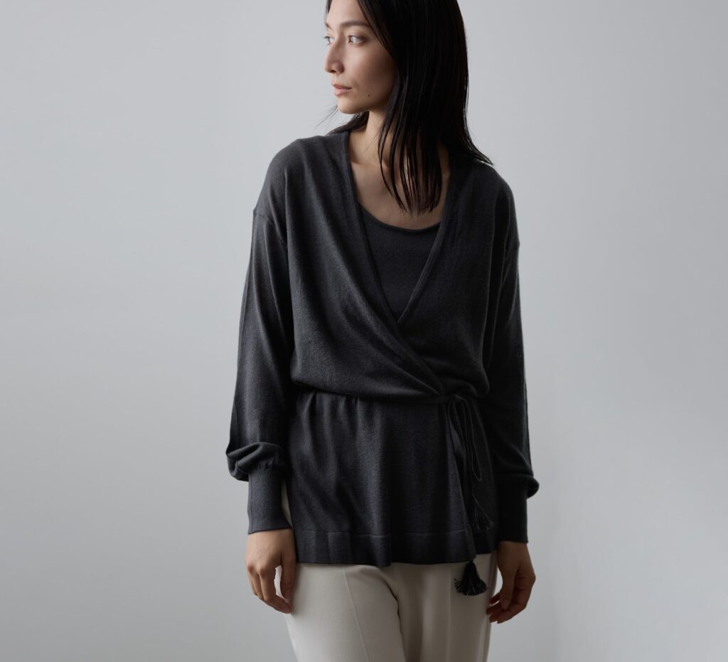 シルクを70%も配合していますので、素肌にまとっても違和感がなく、むしろスッと溶けて一体化するような着心地。そこにカシミヤ特有の”ぬめり感”が加わり、身体が本来の落ち着きに定まるような安定感があります。