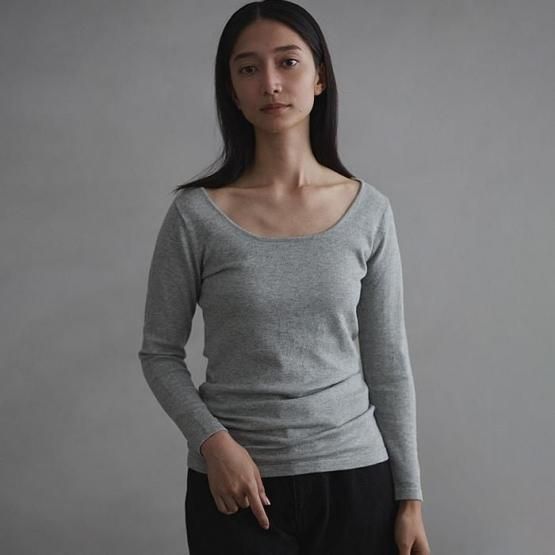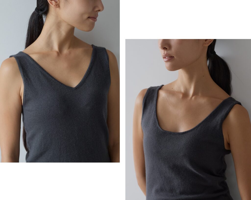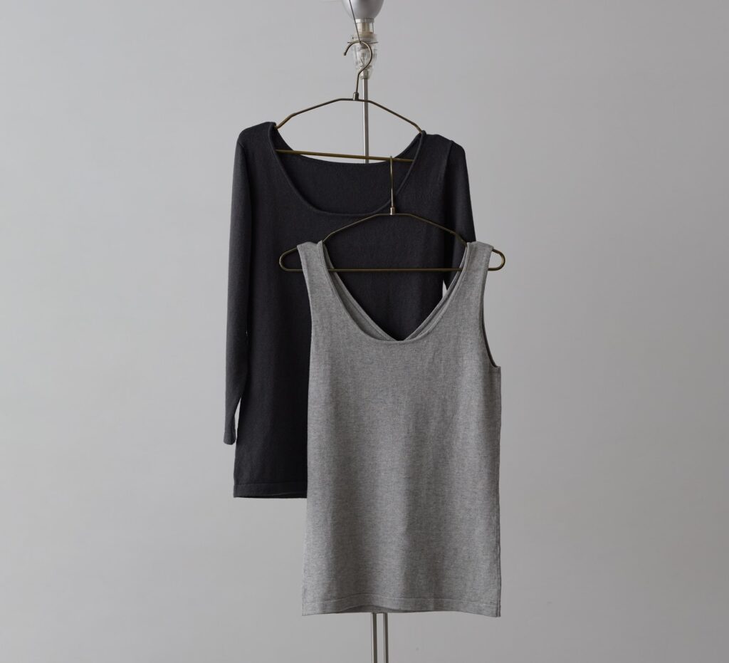 大きめに開けた襟ぐりのおかげで、首周りが広いトップスを着てもインナーが見えてしまう心配もありません。
