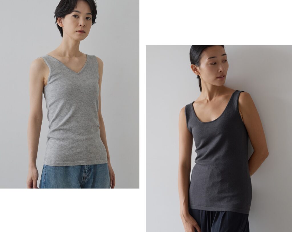 きちんと防寒したい方はロングスリーブ、今から着られて、冬でも身軽で装いたい方はタンクトップを。