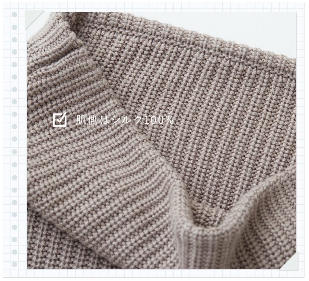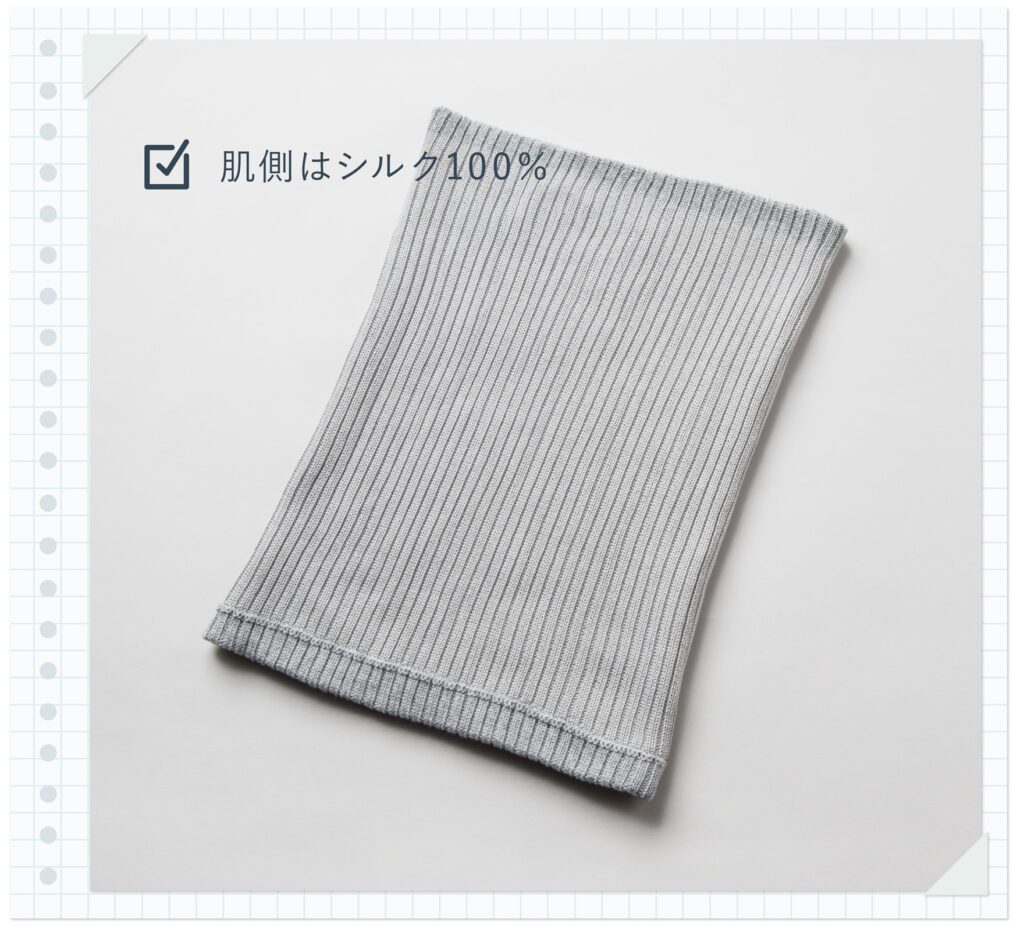 敏感な首やアゴに触れる内側部分はシルク100%なので、ふわっと包まれる心地です。敏感肌さんでも乾燥肌さんでも安心して使えます。
