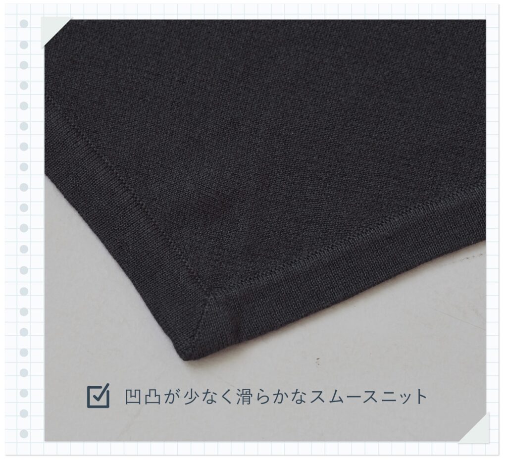 シルク85%にカシミヤもたっぷり15%入っているので、肌に吸い付くしっとりとした心地とふんわりした暖かさ。両面編みのスムースニットなので、裏表を気にすることなく使えます。編目が詰まっているため型崩れもしにくいんです。