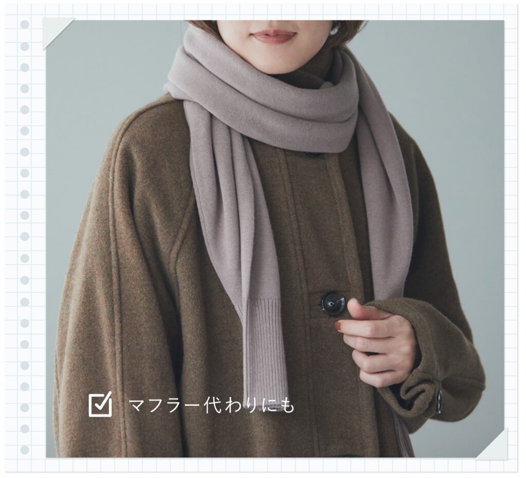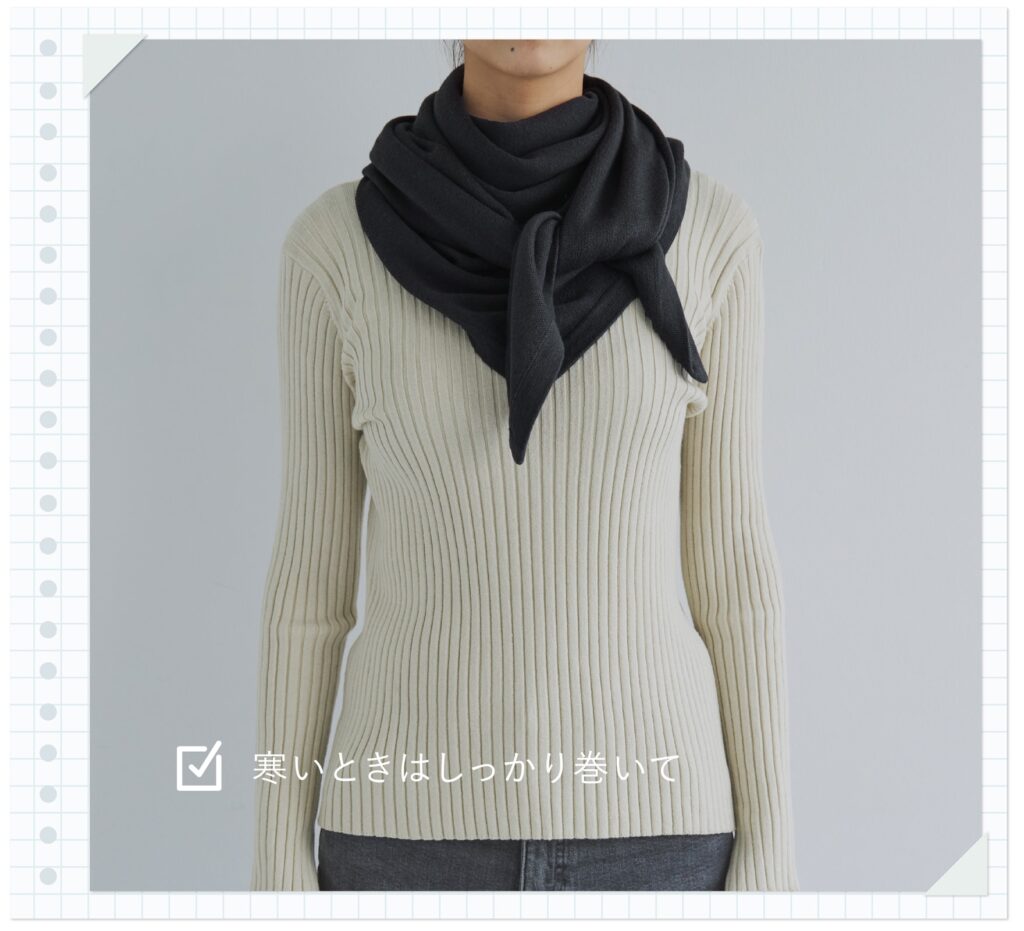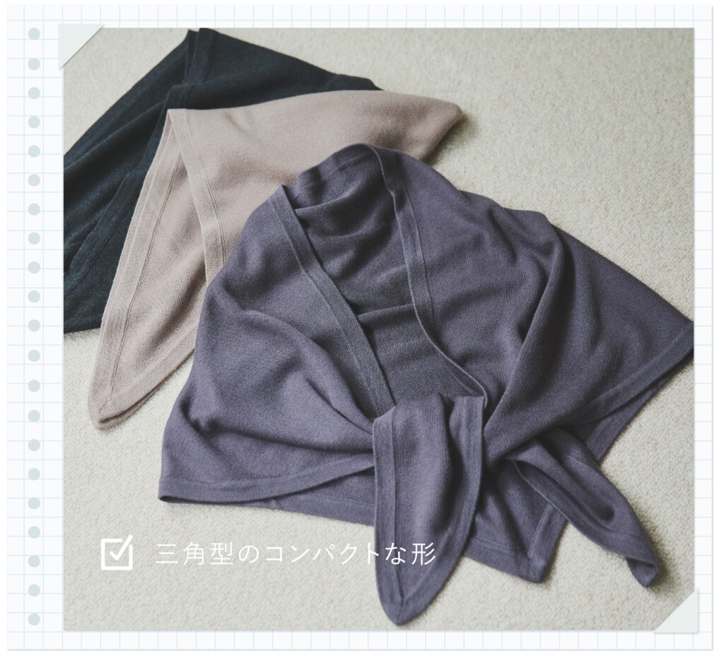 もちろん、アウターの上からサッとかけるのもオススメです。コンパクトに畳めるので、朝晩の寒暖差が激しい日などは、カバンにそっと忍ばせてあげてください。