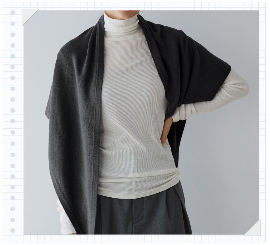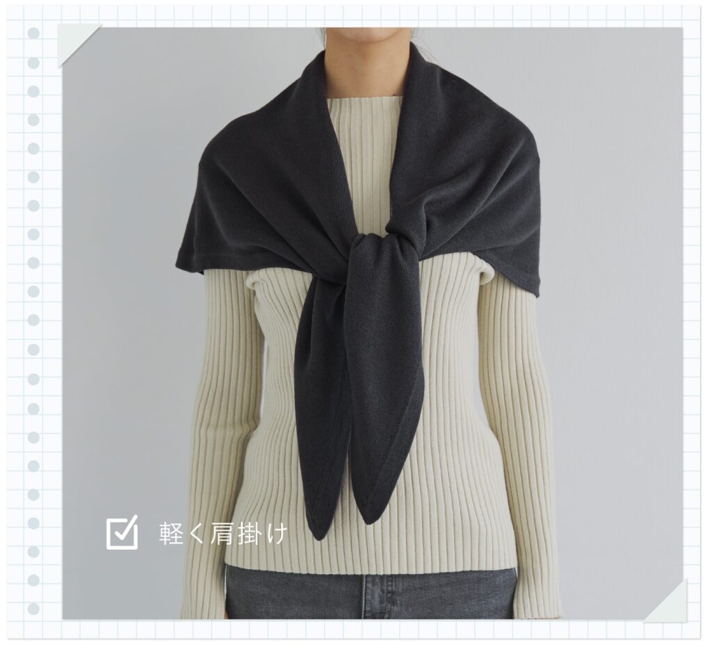 軽く肩にかけて、シンプルに胸の前でクルッと巻くだけでもコーディネートのポイントに。肩や背中が温められるので、屋内でも活躍します。