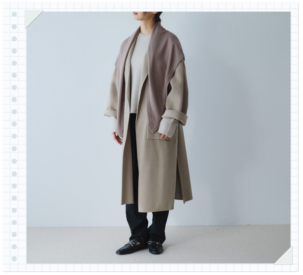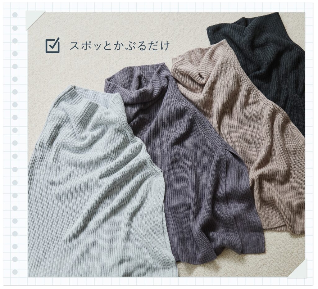 忙しい朝でも、家でくつろぐ時間でも、首・肩・背中までを包み、着こなしも温かさも底上げしてくれます。
