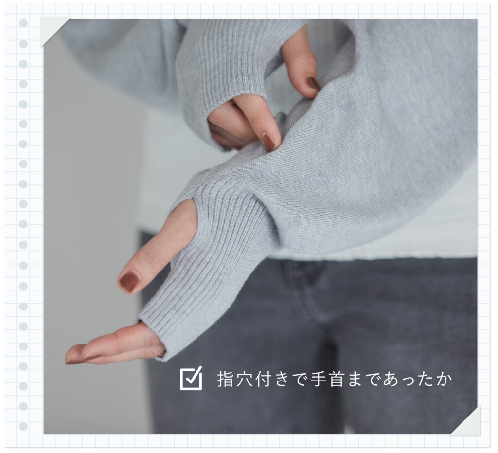 袖口には縫い目を利用した指穴を開けました。手首をしっかり覆うので、あたたかく感じられますし、パソコンや家事などの作業の邪魔になりません。