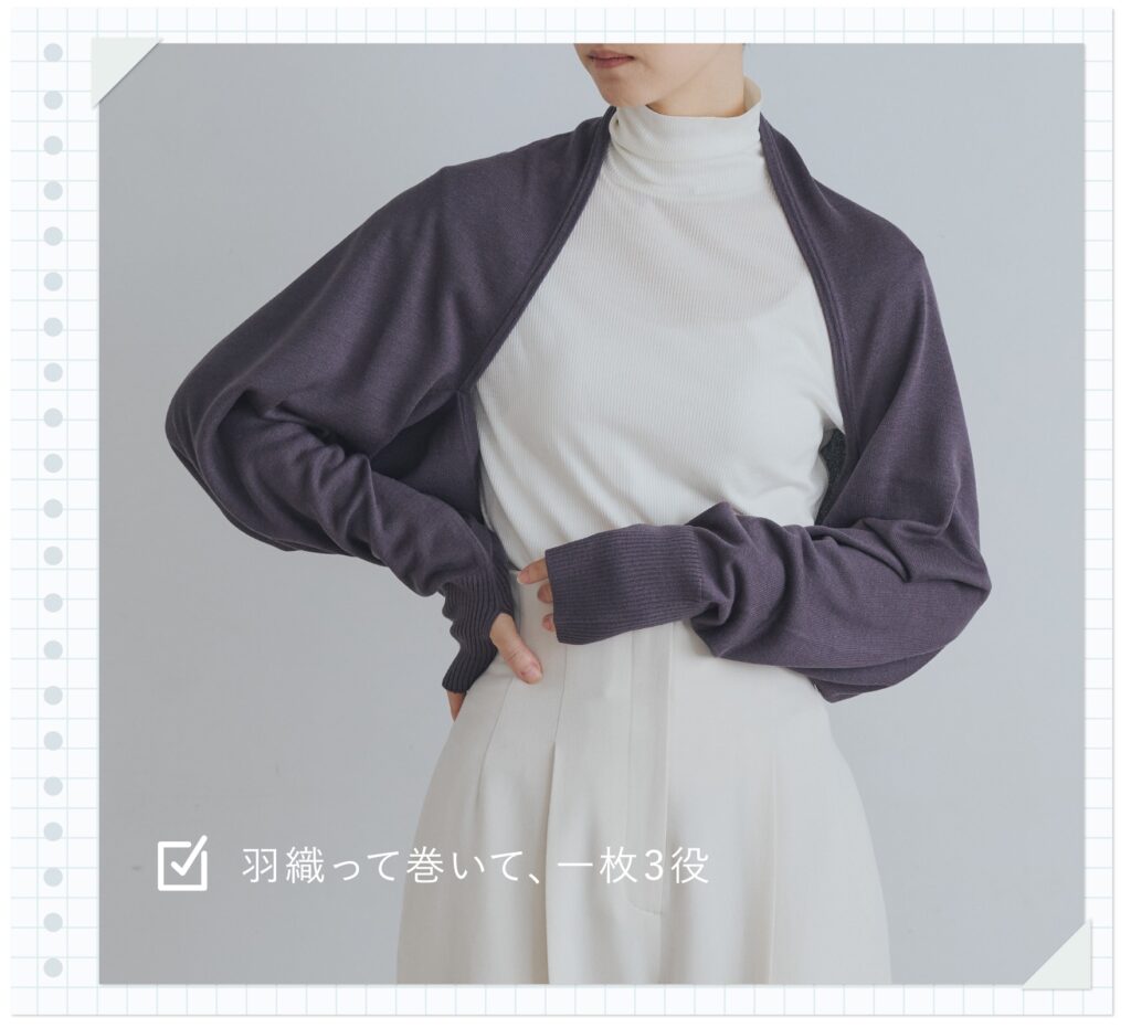 シーズンレスで使えるマルチボレロは、羽織ってカーディガン、巻いてマフラー、肩に掛けてストールと、一枚で3通りの使い方ができる優れモノ。