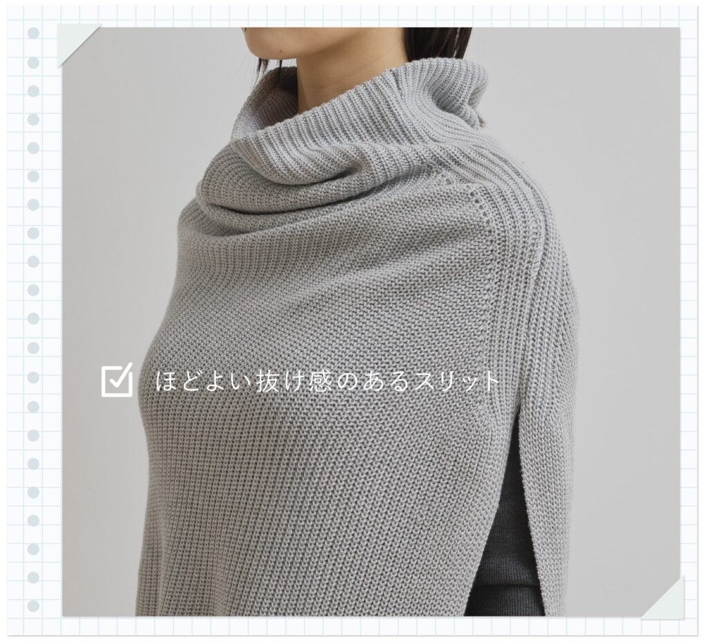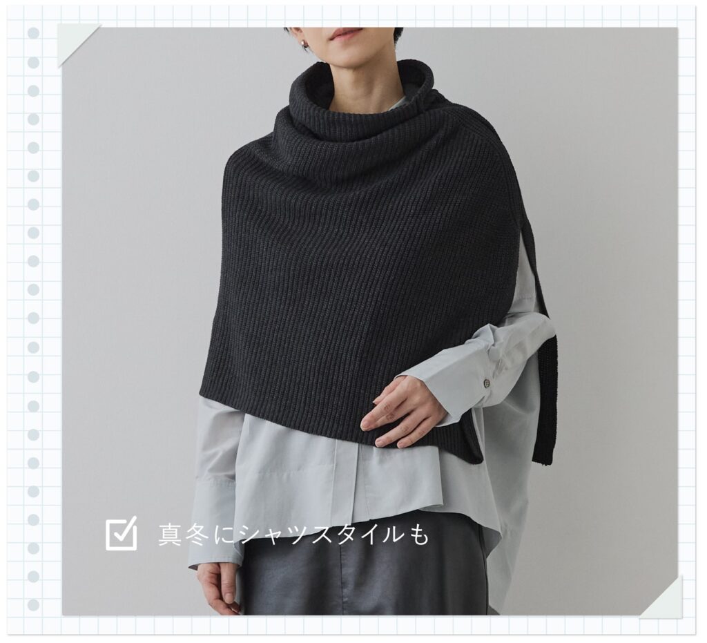 マンネリしがちな冬コーデ。特に寒さが本格的になるとニットを着るしかありませんよね。でもこのニットケープは、ベストやカーディガン感覚で使えるので、薄手のシャツに合わせることも簡単。私もシャツが着たいけど寒いかな〜というときはこのニットケープを重ねています。