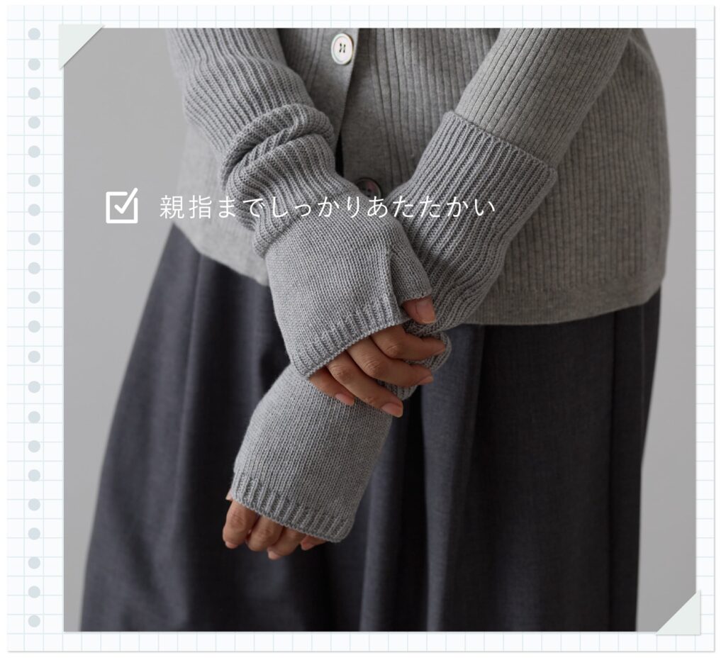 毎年寒くなると欲しいなと思っていた和服に合うアームウォーマー、肌ざわり重視でカシミヤのものを探していたのですが、やっとこちらで見つけました。優しい肌ざわりでとても温かく、程良い厚さもあって袖口から見える腕がとても綺麗に見えました。届くまで多少の不安はありましたが買って正解でした。収納袋もついているので生地を傷めずバックに入れられるのも嬉しいポイントです☆