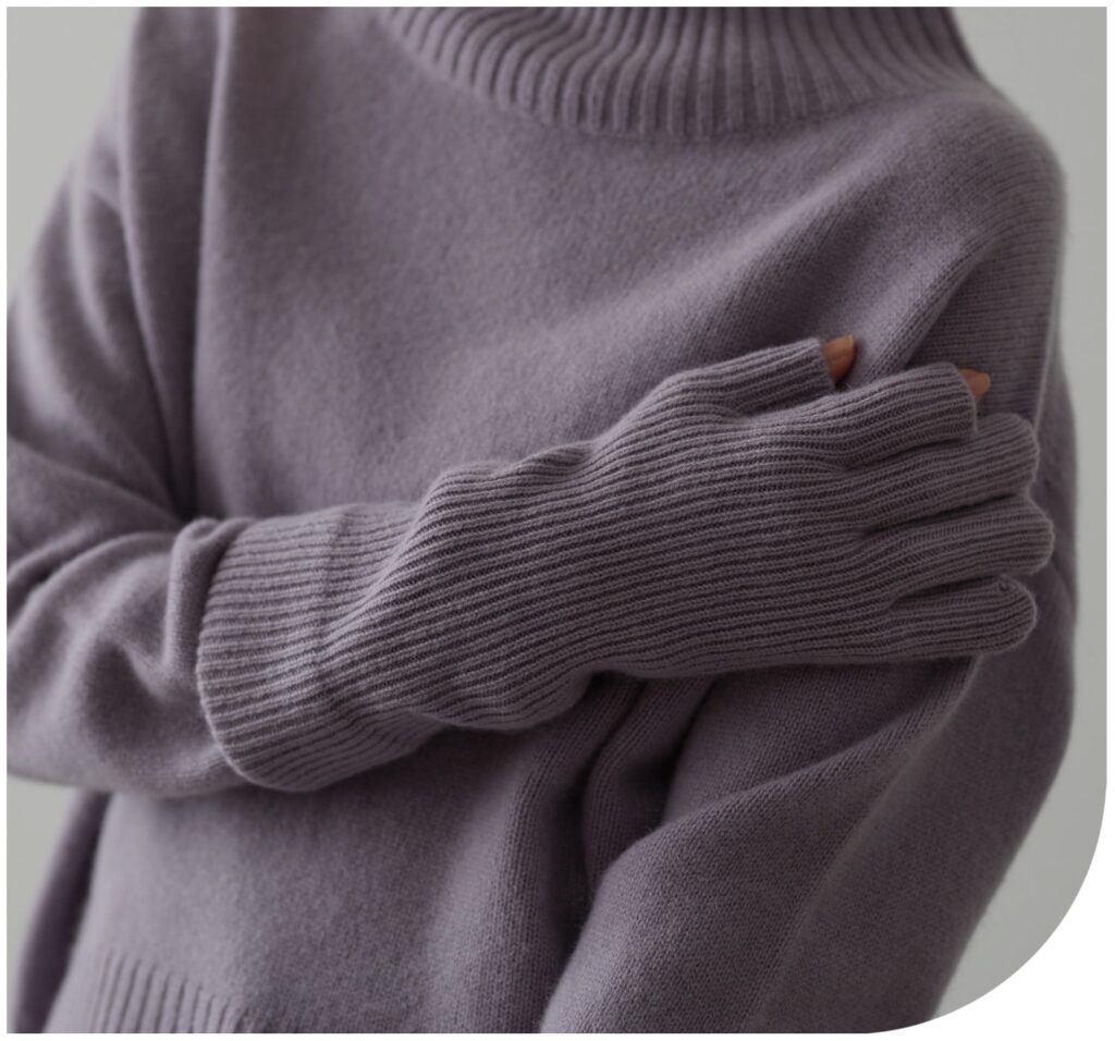 冬の盲点が「手首」。袖口から入り込む冷気は、想像以上に体温を奪います。このカシミヤ手袋はまるで雲に包まれているようなあたたかさ。指先が出るデザインなので、スマホ操作、PC作業、家事の邪魔にならずオンオフ使えます。カシミヤのしっとりとした質感は、乾燥しがちな冬の手肌にも優しい肌当たりです。