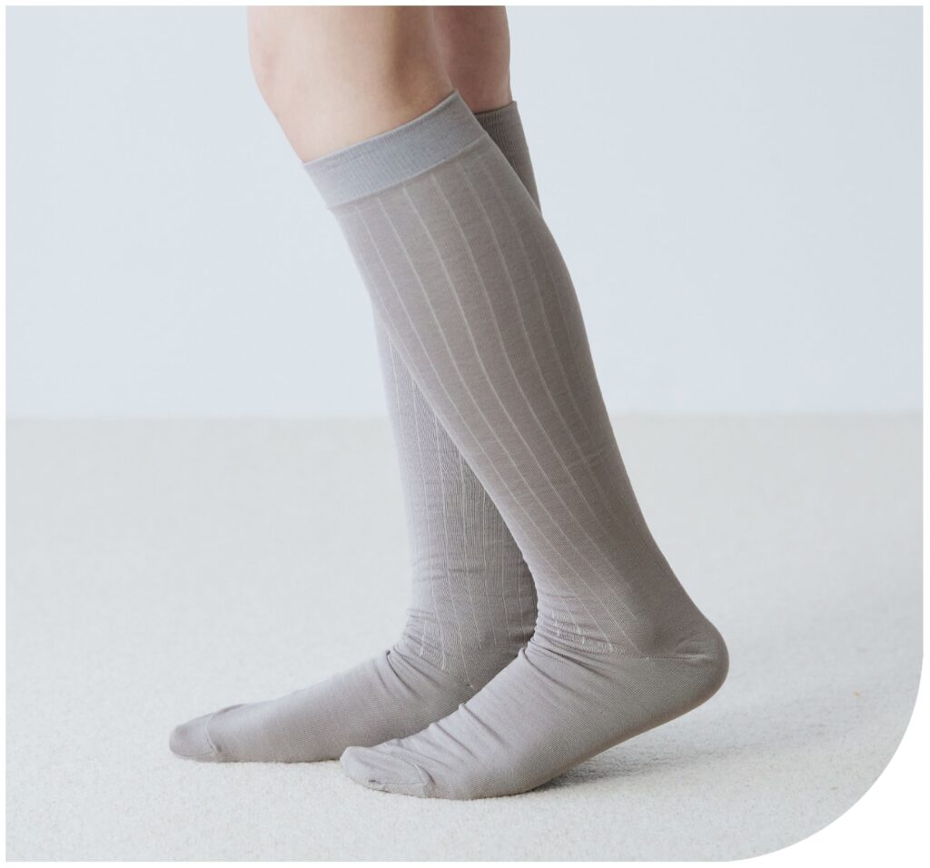 膝下までしっかり覆うハイソックスは、第二の心臓と呼ばれる、ふくらはぎのポンプ機能をサポートします。