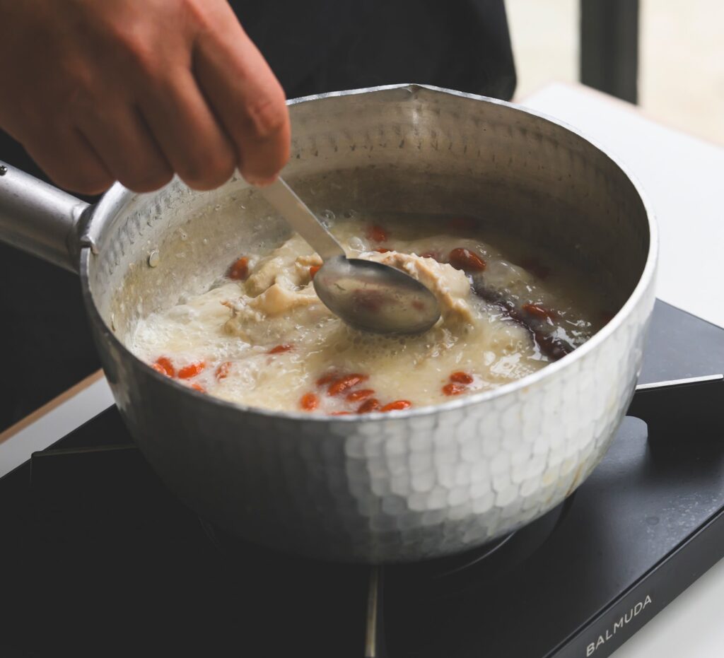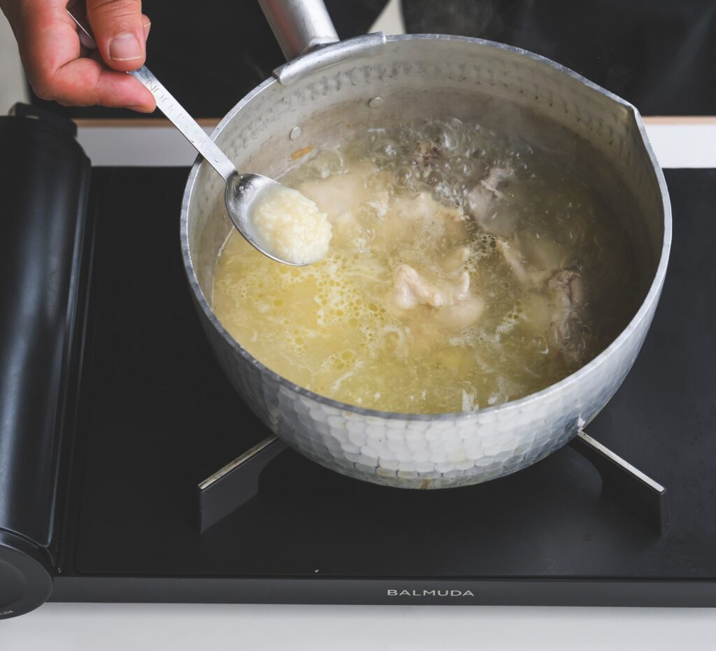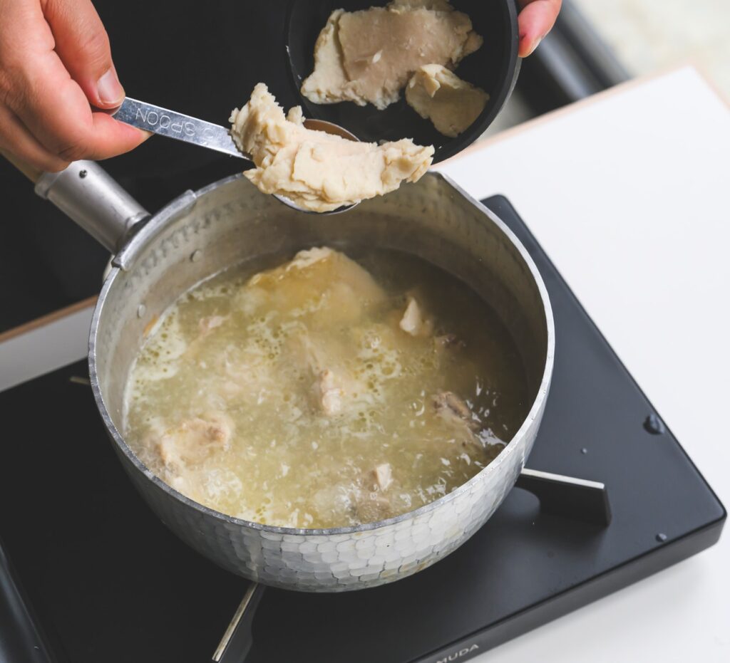 (2)すりおろした生姜と酒粕を加え、酒粕を溶かす。