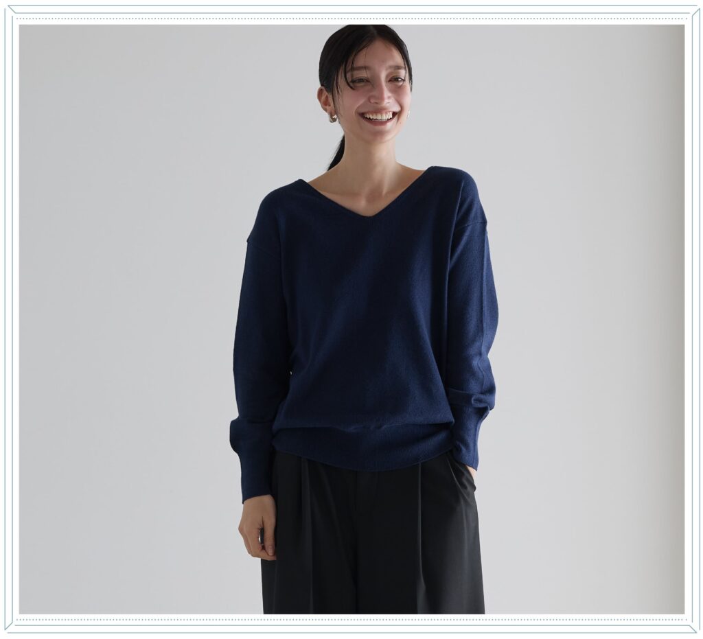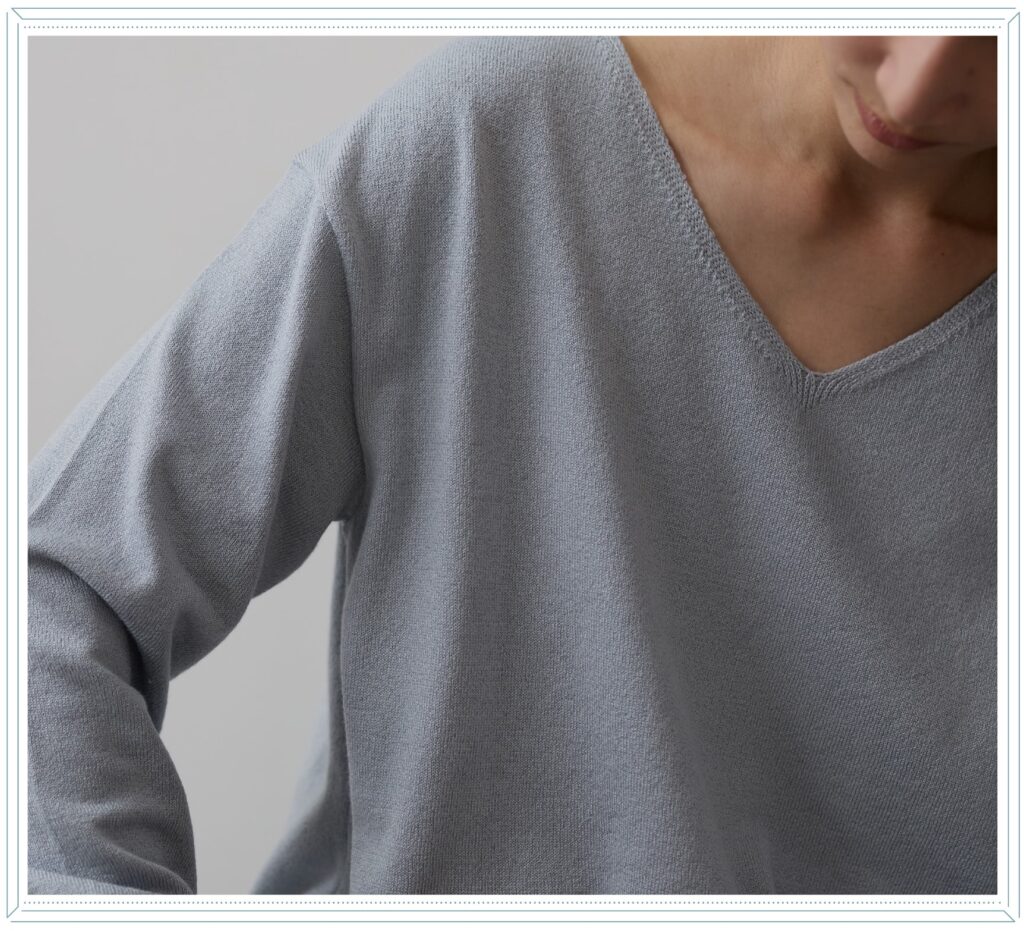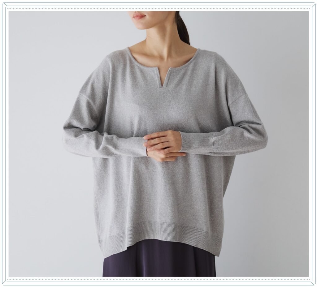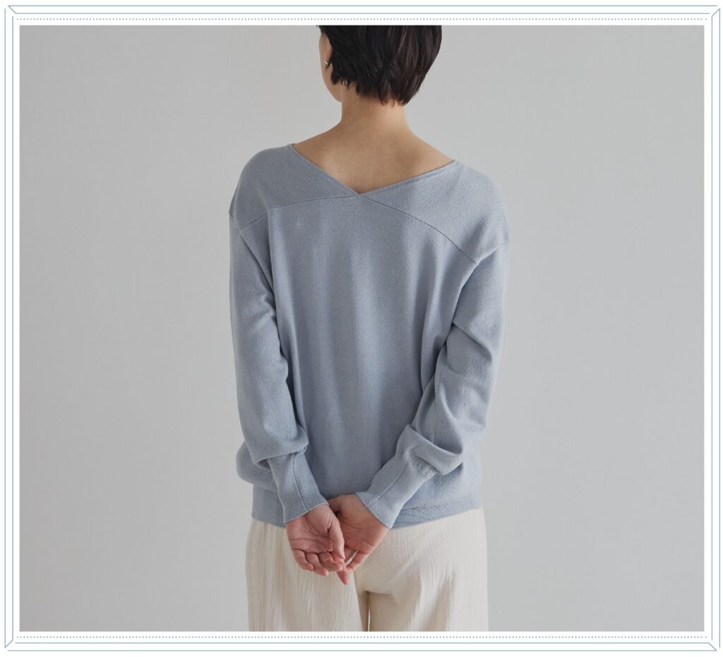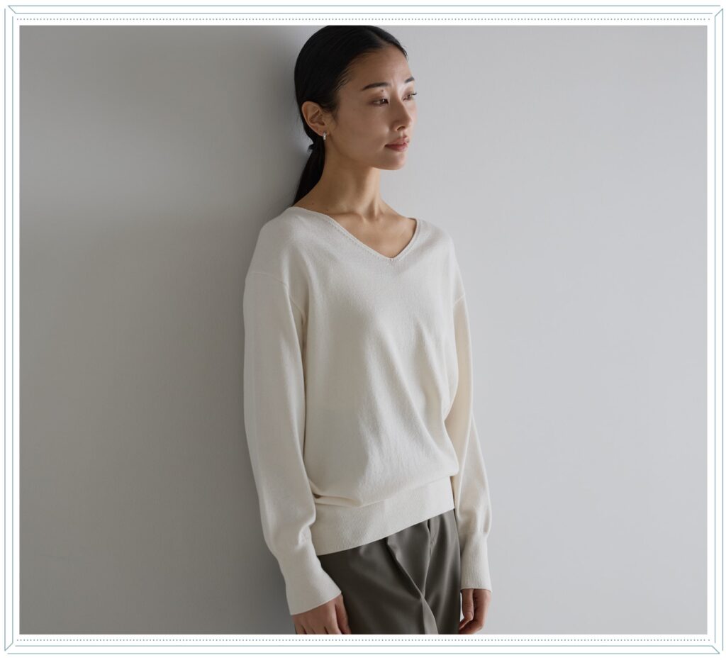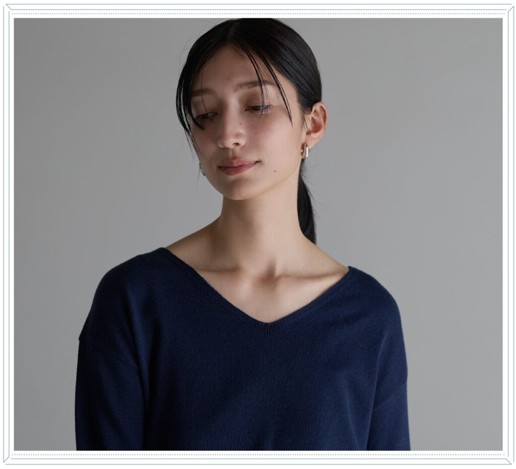 シルクコットンのしなやかな生地感が、Vネックのラインに沿ってすっと流れ、着るだけでデコルテ周りに品が宿ります。キーネックよりも少し女性らしいニュアンスが出るので、友達とのランチ会や、休日のきれいめコーデにもぴったりの一枚。