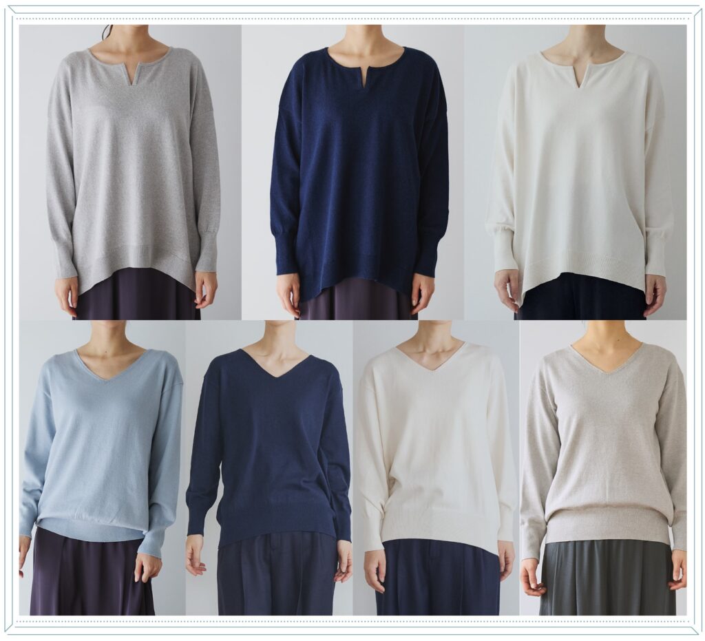 キーネックニットは、杢グレー・ネイビー・オフシロの3色。Vネックニットは、ブルーグレー、ネイビー、オフシロ、杢グレーの4色。どれを選んでも肌馴染みが良く印象が変わるので、2枚目・3枚目と追加されるお客様も多いアイテムです。