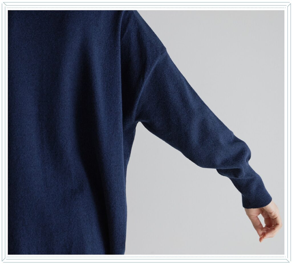 全体のシルエットはゆったりで、体のラインを拾わないたっぷりとした身幅。裾はキュッと締めるのではなく、落ち感が美しく見えるフレアラインに仕上げています。ドロップショルダーで肩まわりはゆとりがありますが、袖口のリブを長めにしてメリハリをつけました。ゆとりのある身幅ですが、抜け感のあるネックラインのおかげで、着膨れすることなく纏っていただけます。