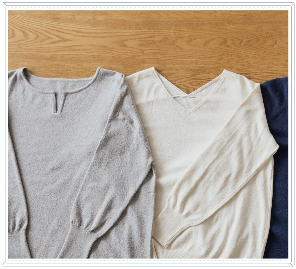 DRESS HERSELFのラインナップの中で、ひっそりと、しかし確実に愛され続けているニットがあります。それが、シルクコットンのキーネックとVネック。
