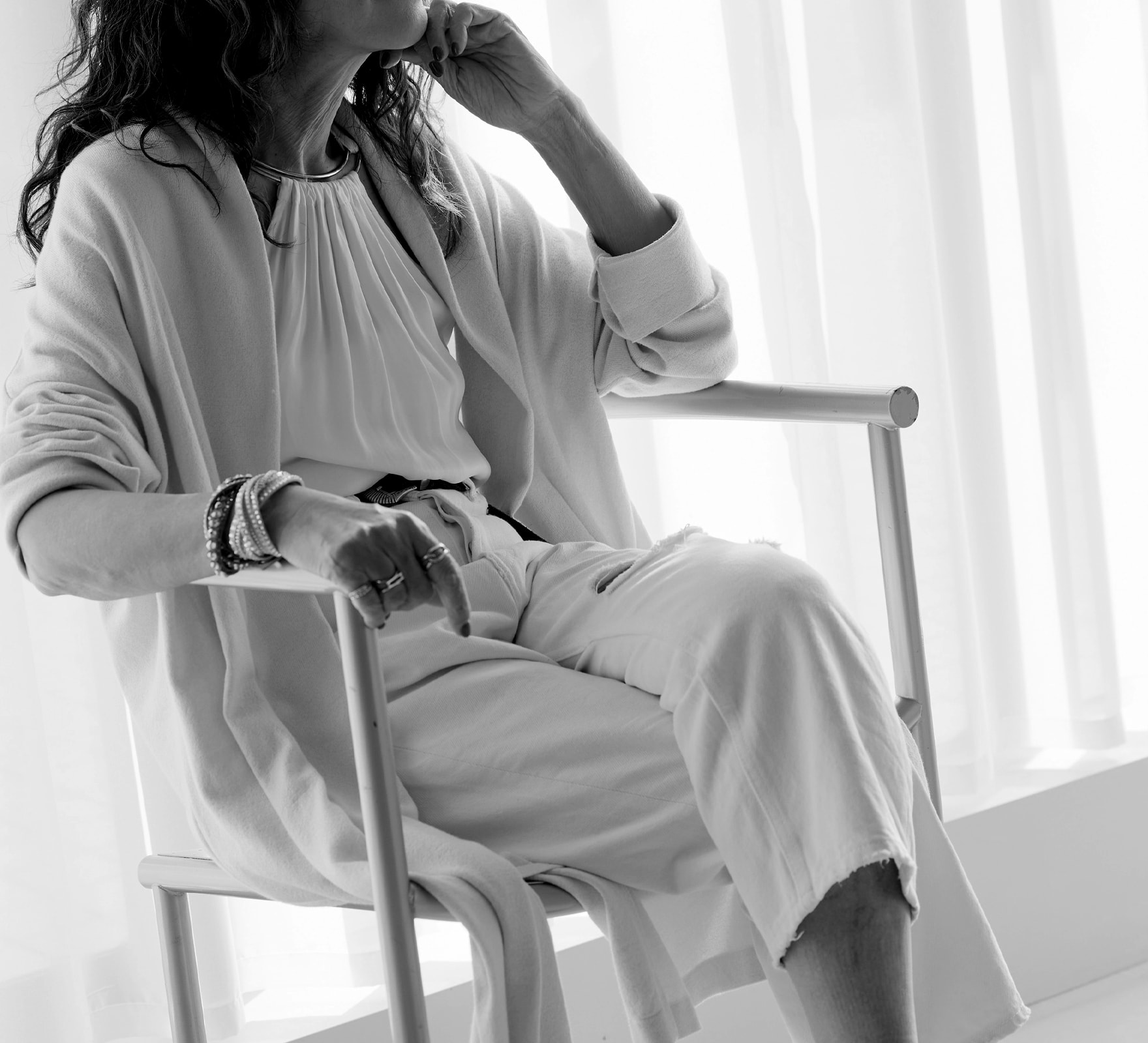 白は膨張色として敬遠される方もいらっしゃいますが、実は着る人の個性を最大限に引き出してくれる素晴らしい色。微妙にトーンの違う白同士を重ねても反発せず、スッと馴染んでその人らしさに繋がっていく。そんな白の力が大好きです。