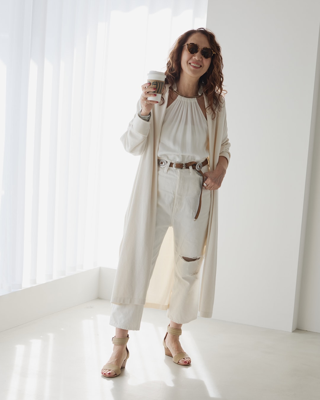 ただ、全体がぼやけないよう引き締めは必要。今回はベルトと靴にベージュを差して、ソフトにまとめてみました。少し黄味のあるロングカーディガンとも美しく調和し、大人の余裕を感じさせるスタイルに。