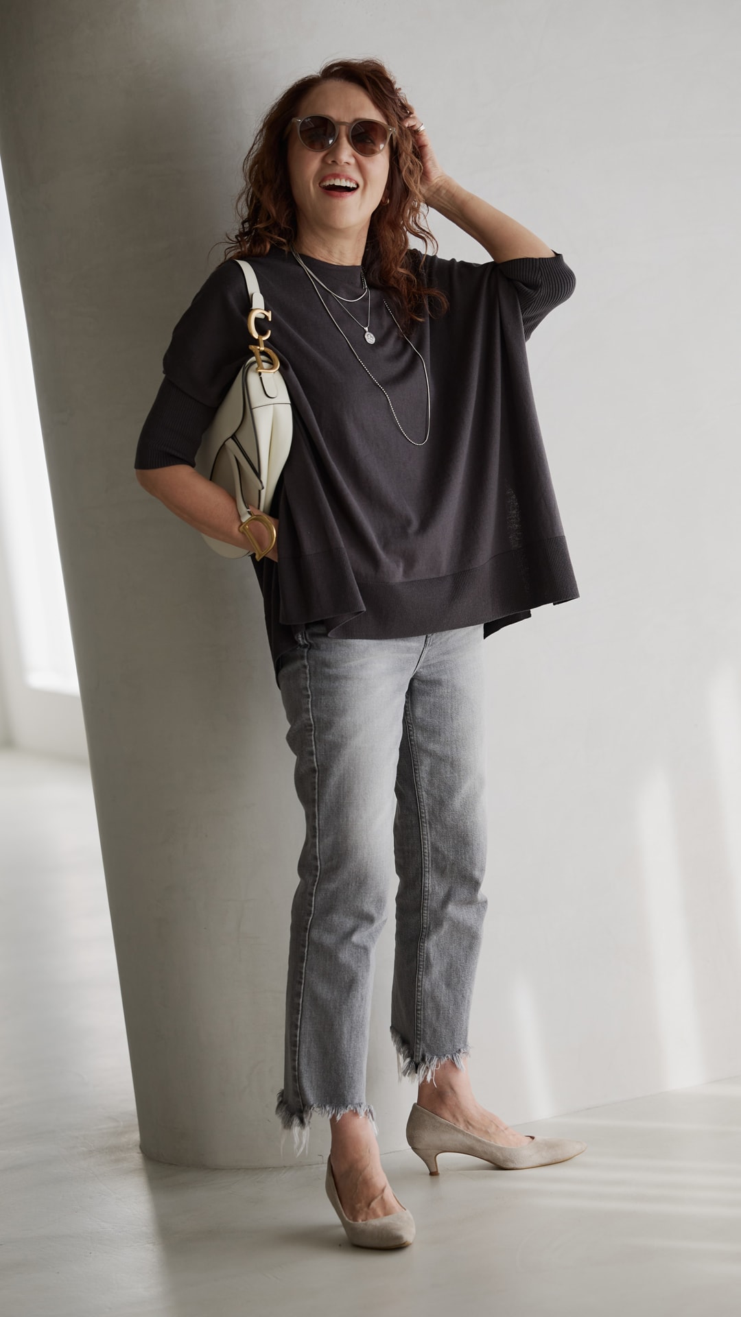 ブルーデニムだと少しカジュアルすぎると感じる日は、迷わずこのウォッシュドブラック(グレー)を投入します。DRESS HERSELFのアイテムは、主張が強すぎる黒をあえてあまり作らない代わりに、どんなアイテムとも合わせやすいチャコールグレーをラインナップしています。