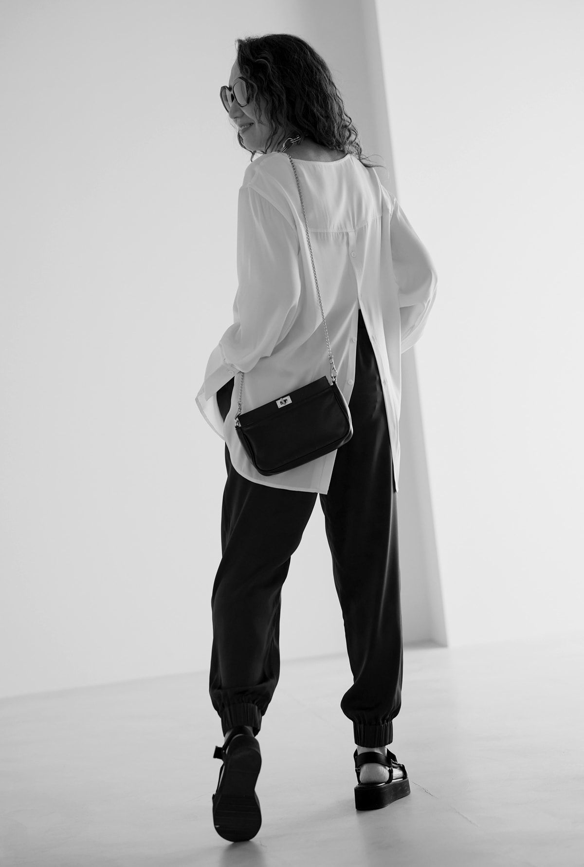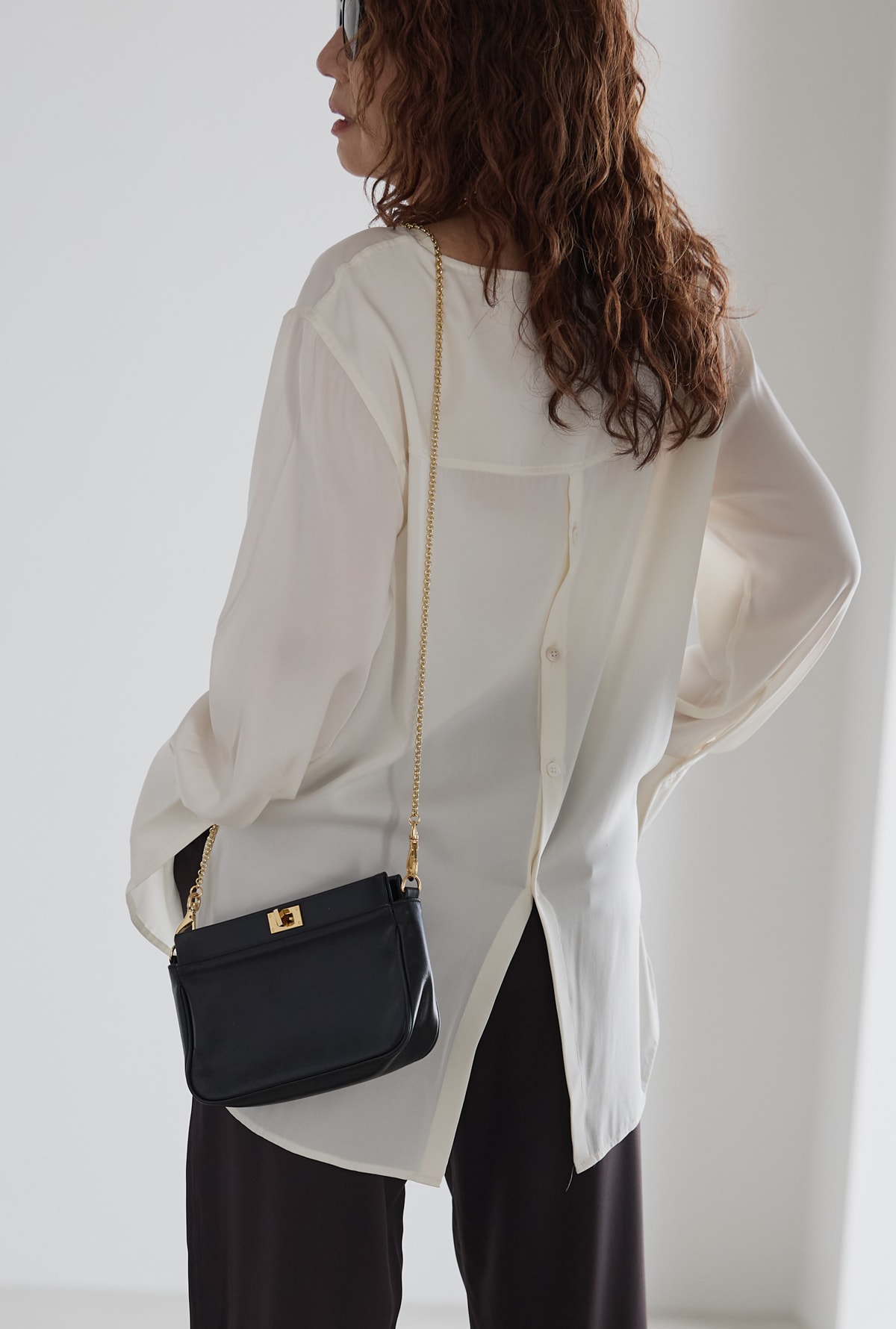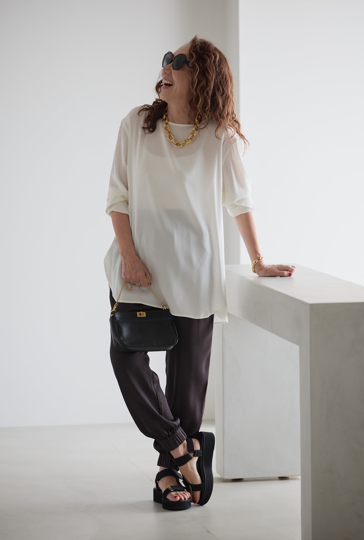 一枚でコーディネートが決まる、頼れる白ブラウス。シルクサテンの艶感があるので、リネンブラウスよりもラフにならず、ちょっとしたランチ会や打ち合わせにも万能なんです。