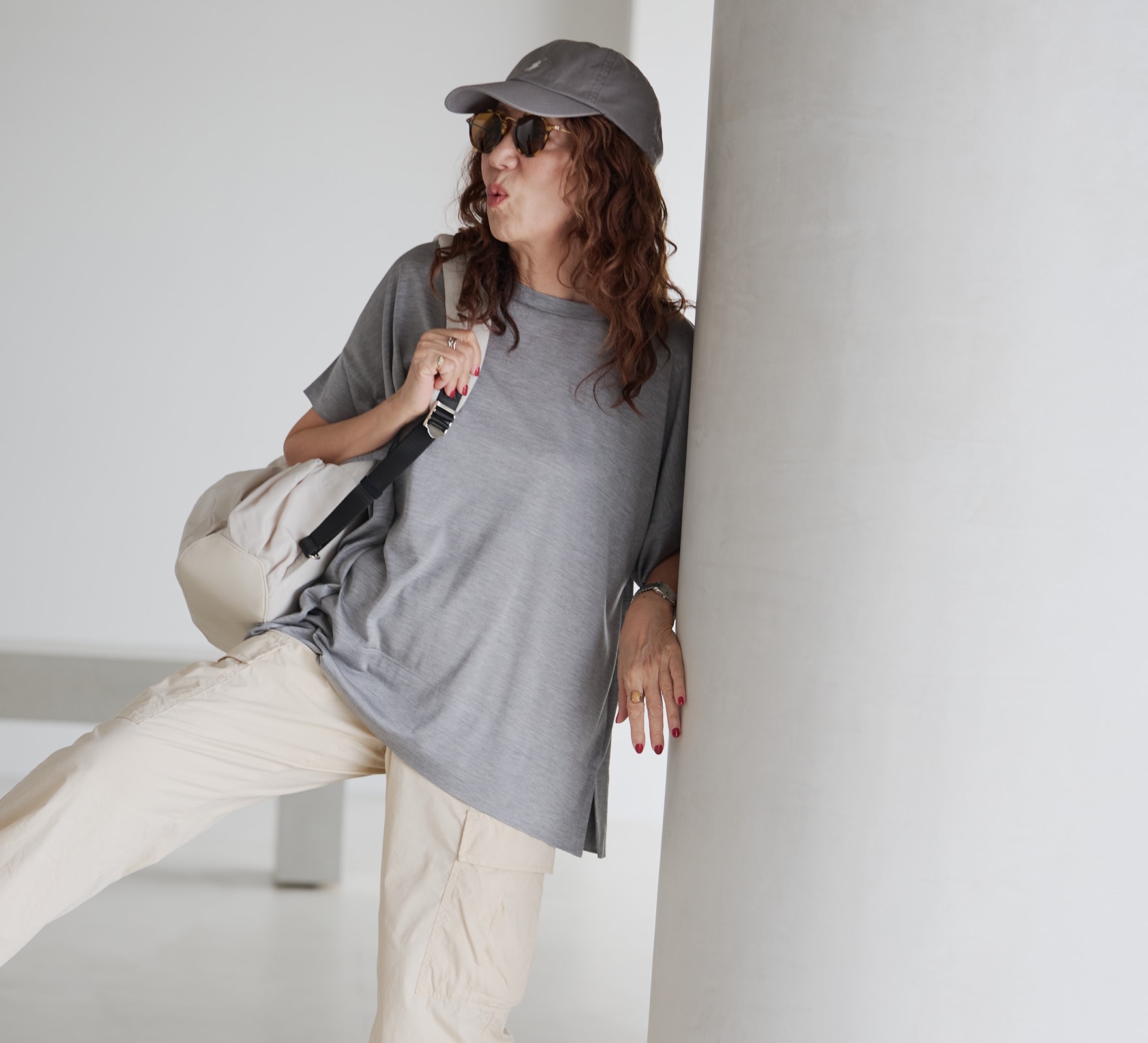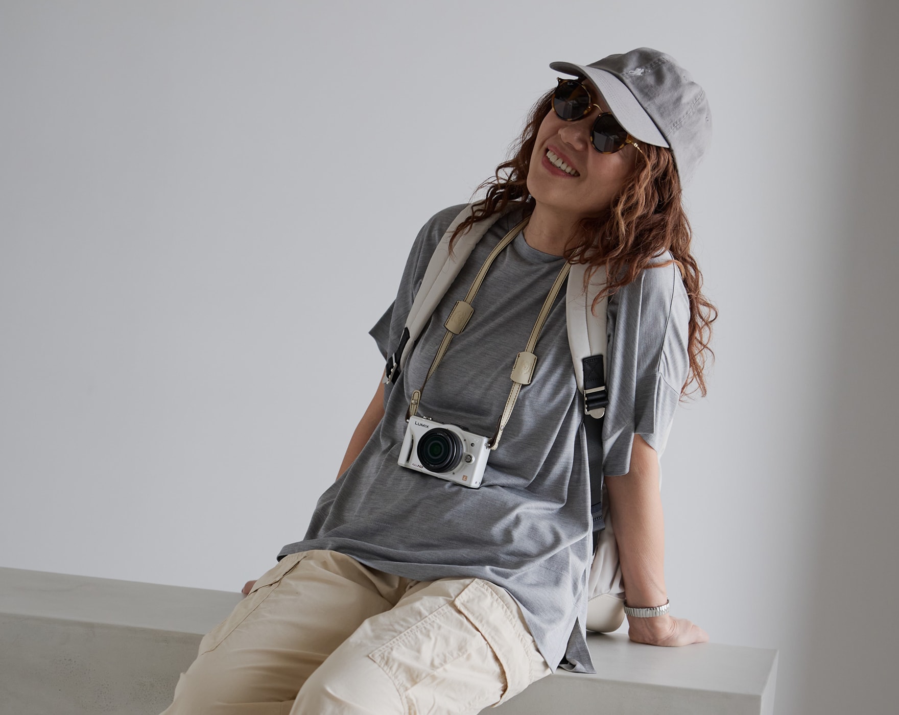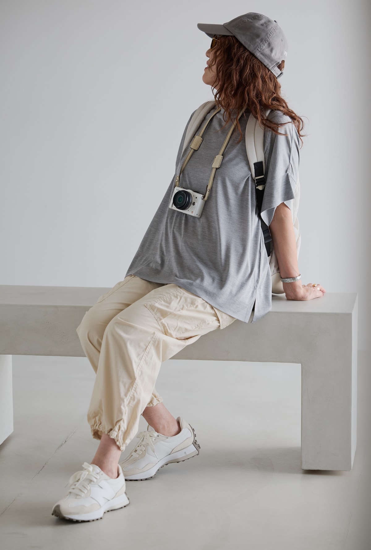 遺跡の中を歩き回りどこにでも座るので(遺跡の見学ってけっこうバッチいのですよ)、さすがに繊細なシルクパンツはもったいなくてはけませんが……この新作のシルクTシャツは旅の必需品。袖が肘の半分くらいまであるので、露出に厳しい宗教寺院などを巡る際にも重宝します。襟や袖ぐりのカッティングは、実際に着てみて初めてその美しさがわかる計算し尽くされた逸品。