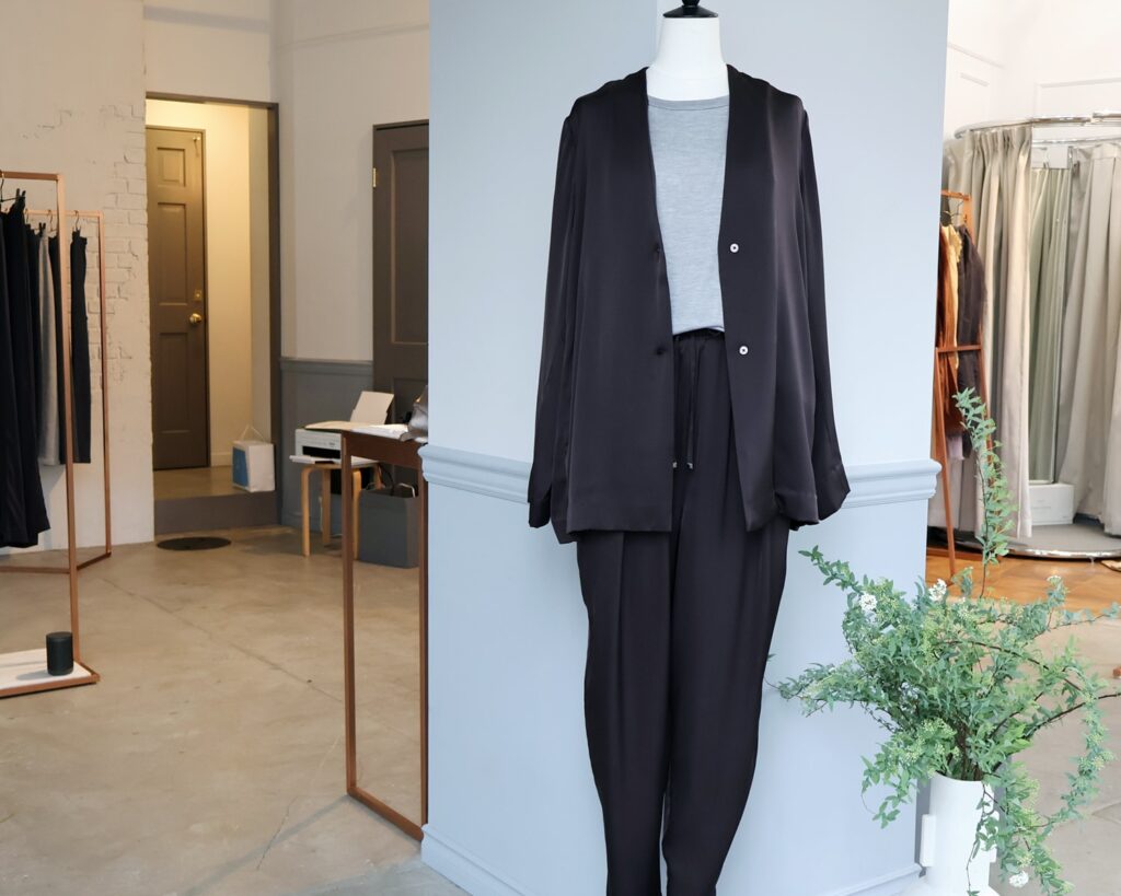 特に、人前でお仕事される方にはサマースーツよりも気軽に着られるという嬉しいお言葉も。お客さまの好反応がダイレクトに伝わり、シルクサテンの着こなし方が広がったと感じました。